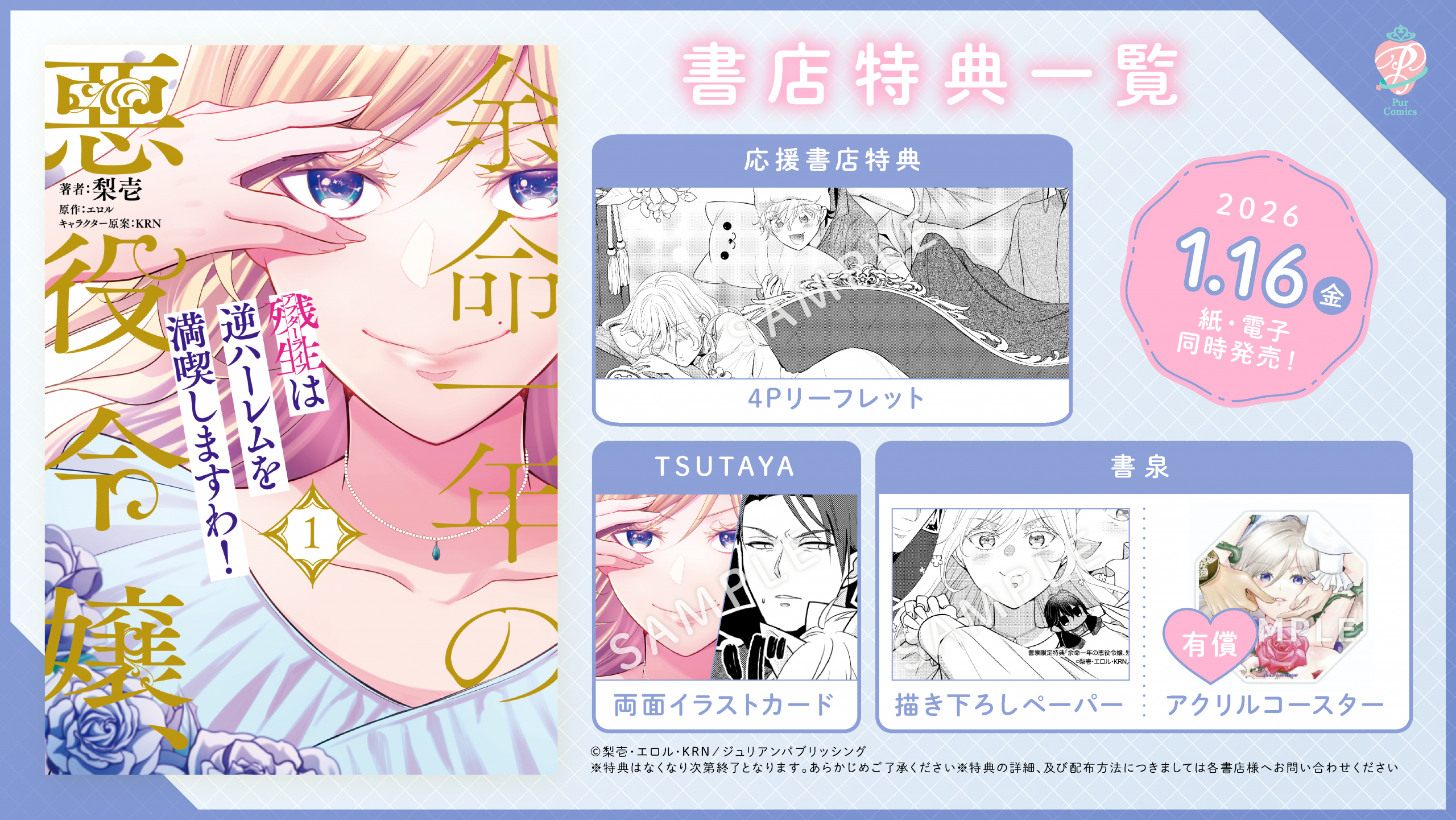 PurComics「余命一年の悪役令嬢、残生は逆ハーレムを満喫しますわ!(1)」のコミックスが1月16日(金)発売!