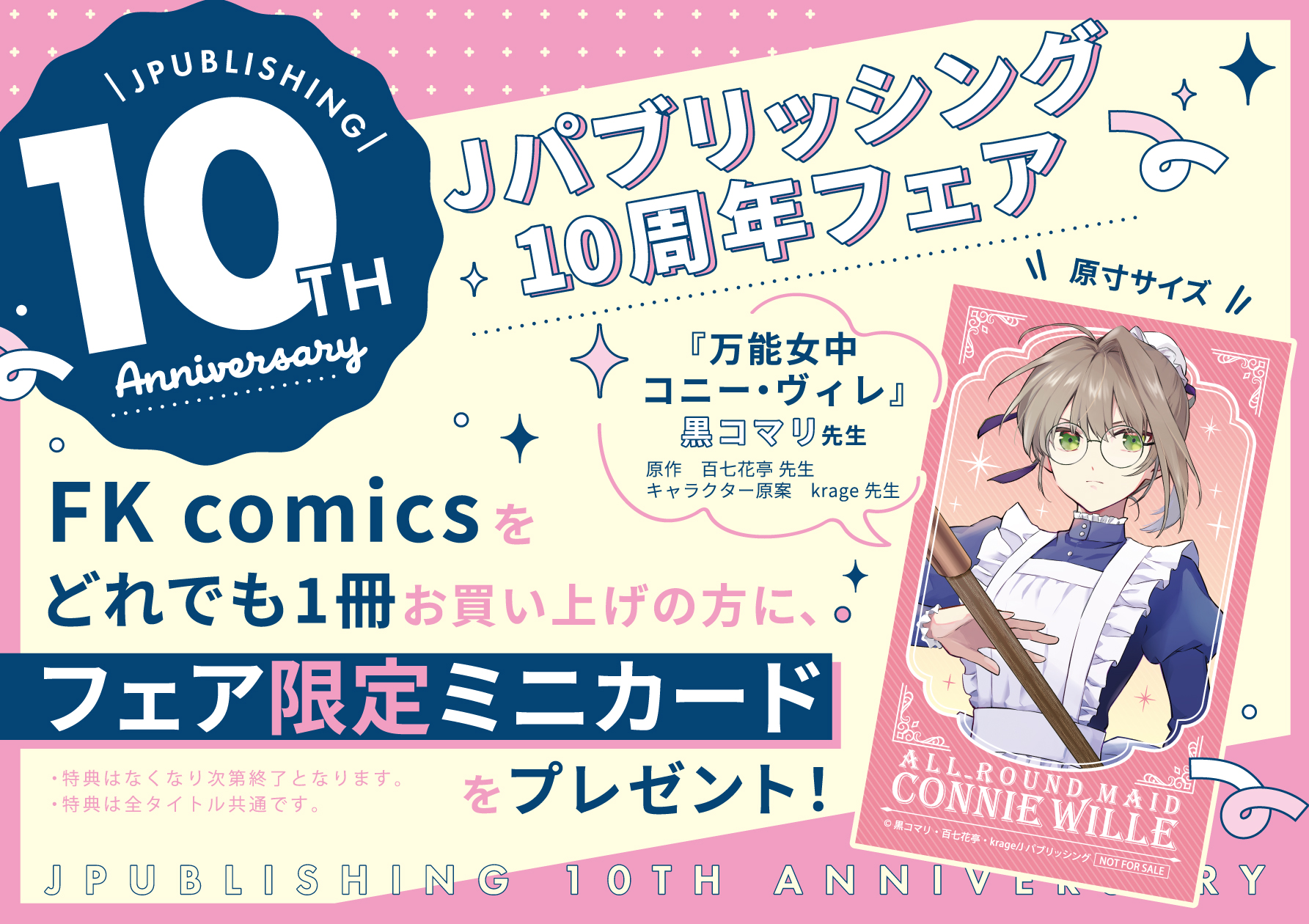 FK comicsを対象店舗様にてどれでも1冊ご購入で、【黒コマリ先生(原作:百七花亭先生)『万能女中コニー・ヴィレ』の限定ミニカード】をプレゼント!ここだけの特別な特典をどうぞお見逃しなく!!