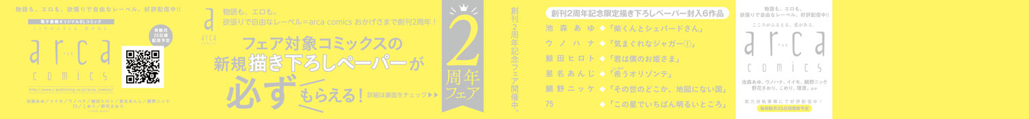 フェア専用の帯がついたarca comicsの既刊を購入すると、対象商品の各タイトルに描き下ろし特典ペーパ―が新たに封入されています!ここでしか読めない記念ペーパ―を是非ゲットしてください☆